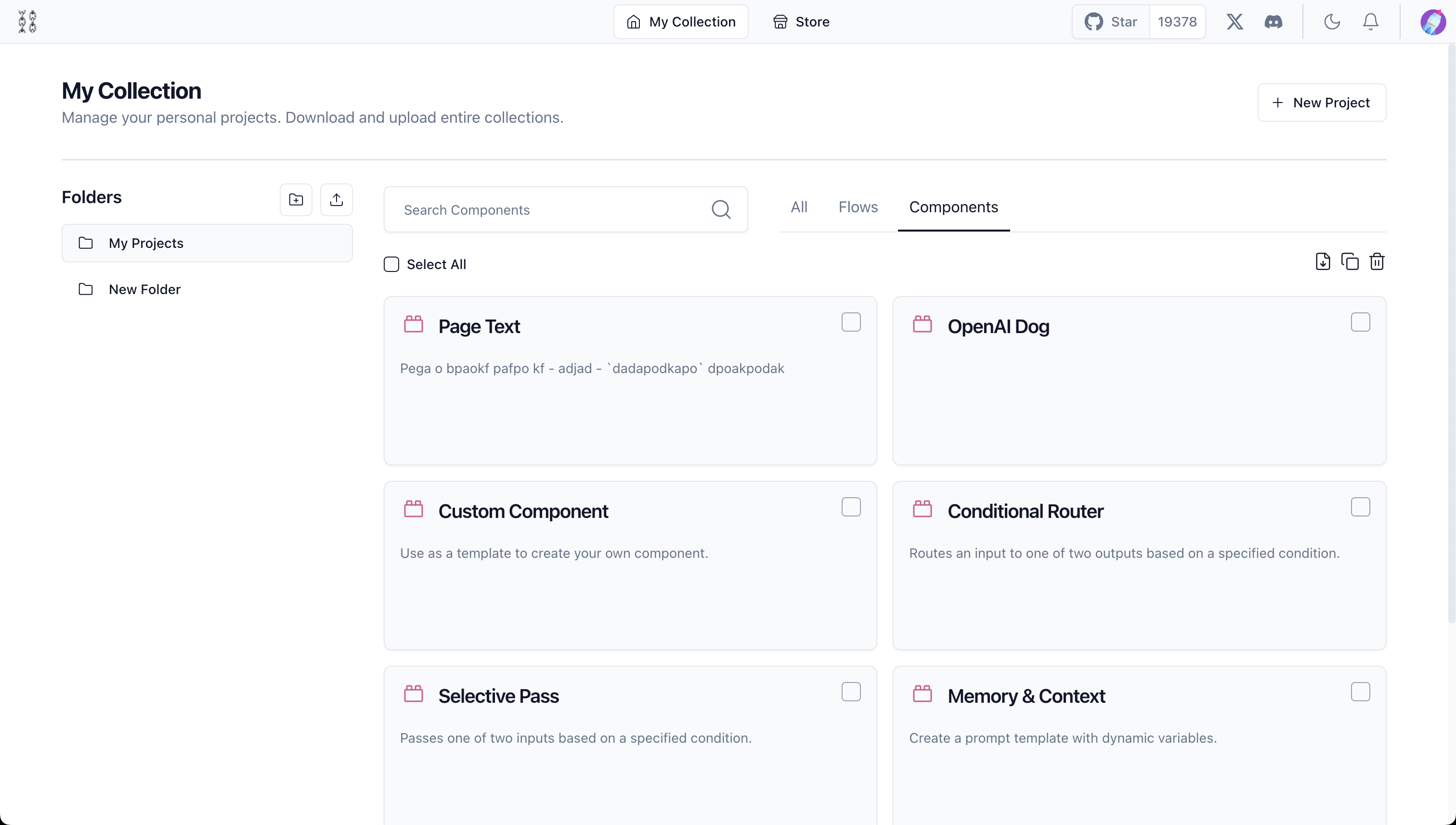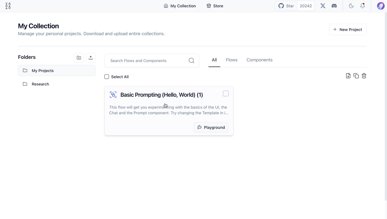My Collection is a space in Langflow where users can manage, organize, and access their flows and components. Flows and components are displayed as individual cards that provide relevant information.