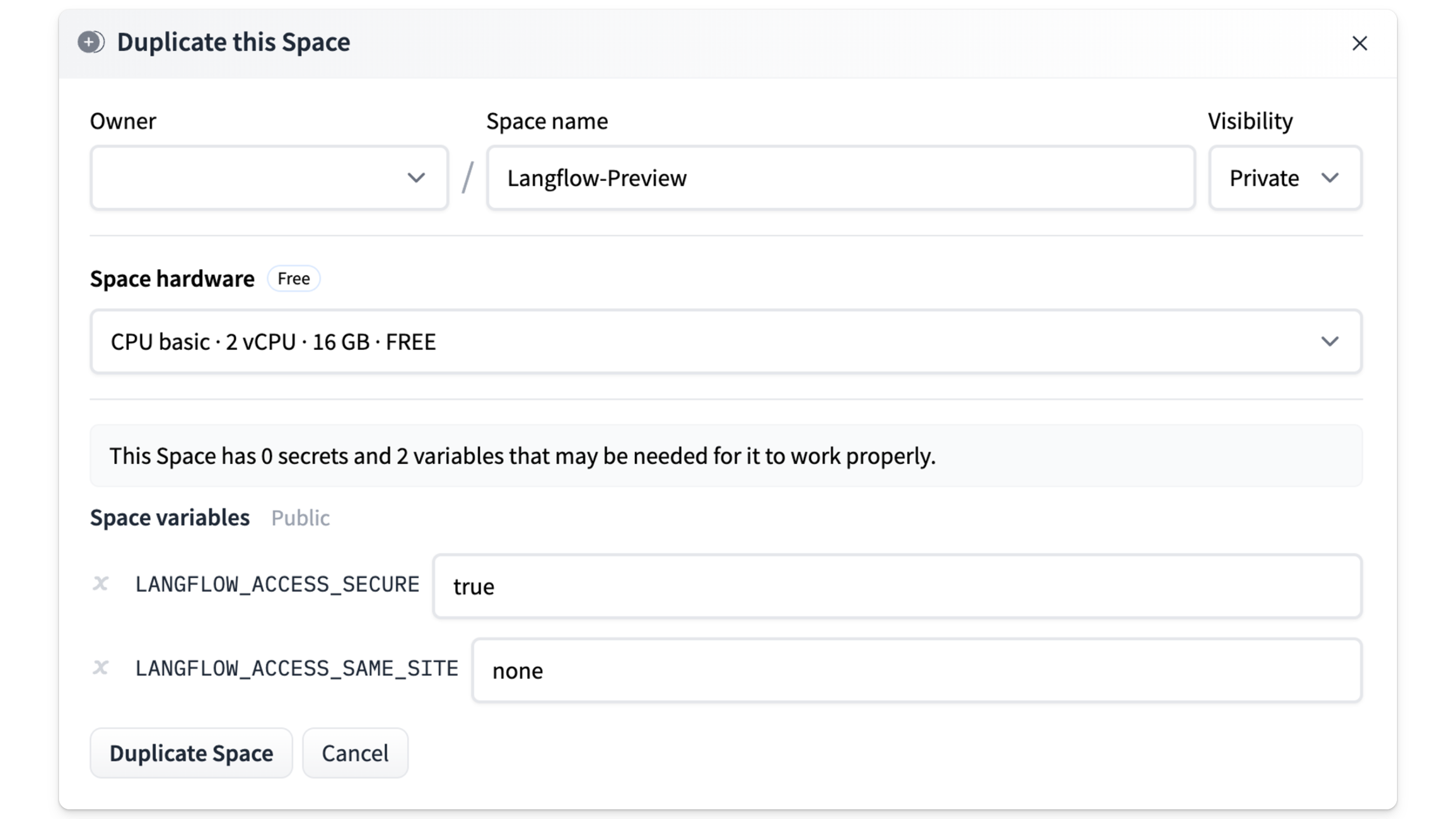 Duplicate the Space: You'll encounter an option to duplicate the Langflow space. This step involves a few simple decisions: