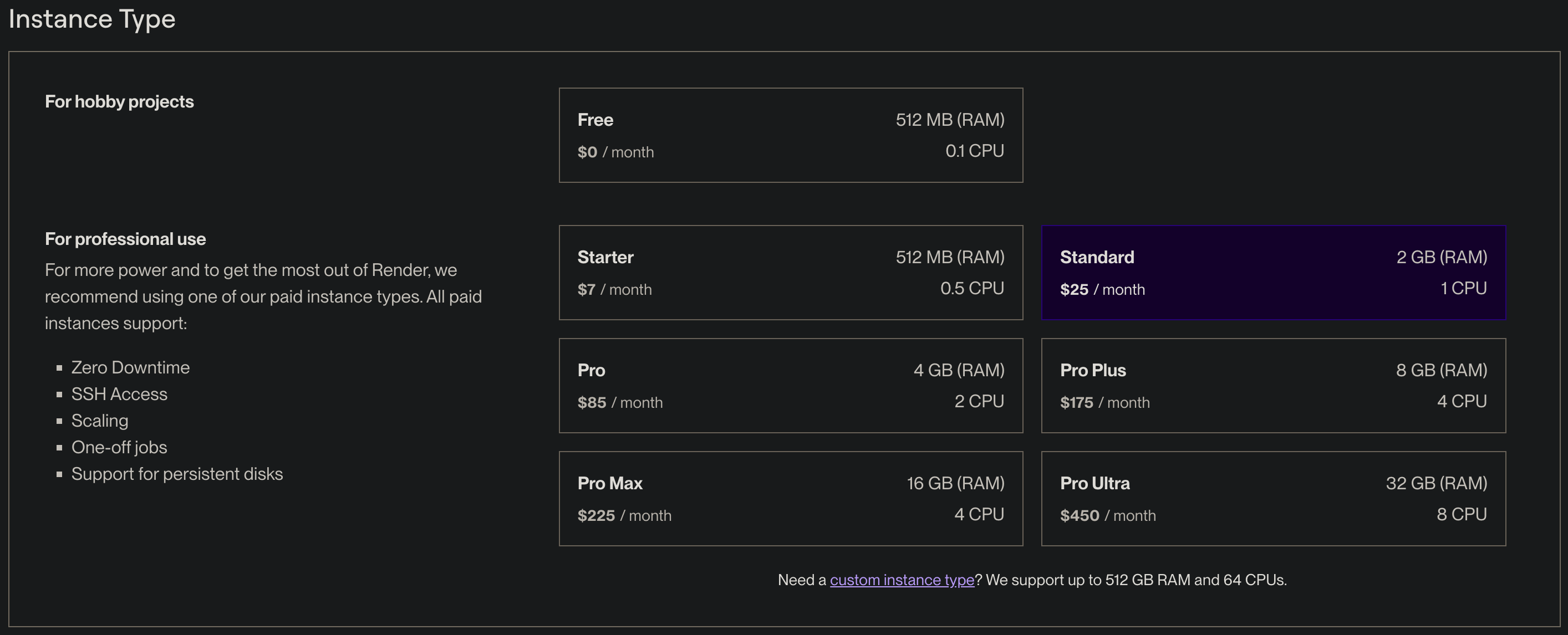 Render instance, because Langflow requires at least 2 GB of RAM to run. This may require a credit card to sign up. Review the pricing details on the Render platform to understand any costs involved before proceeding. If you need to change your plan later, from the Render dashboard, go to Settings > Instance Type. -
