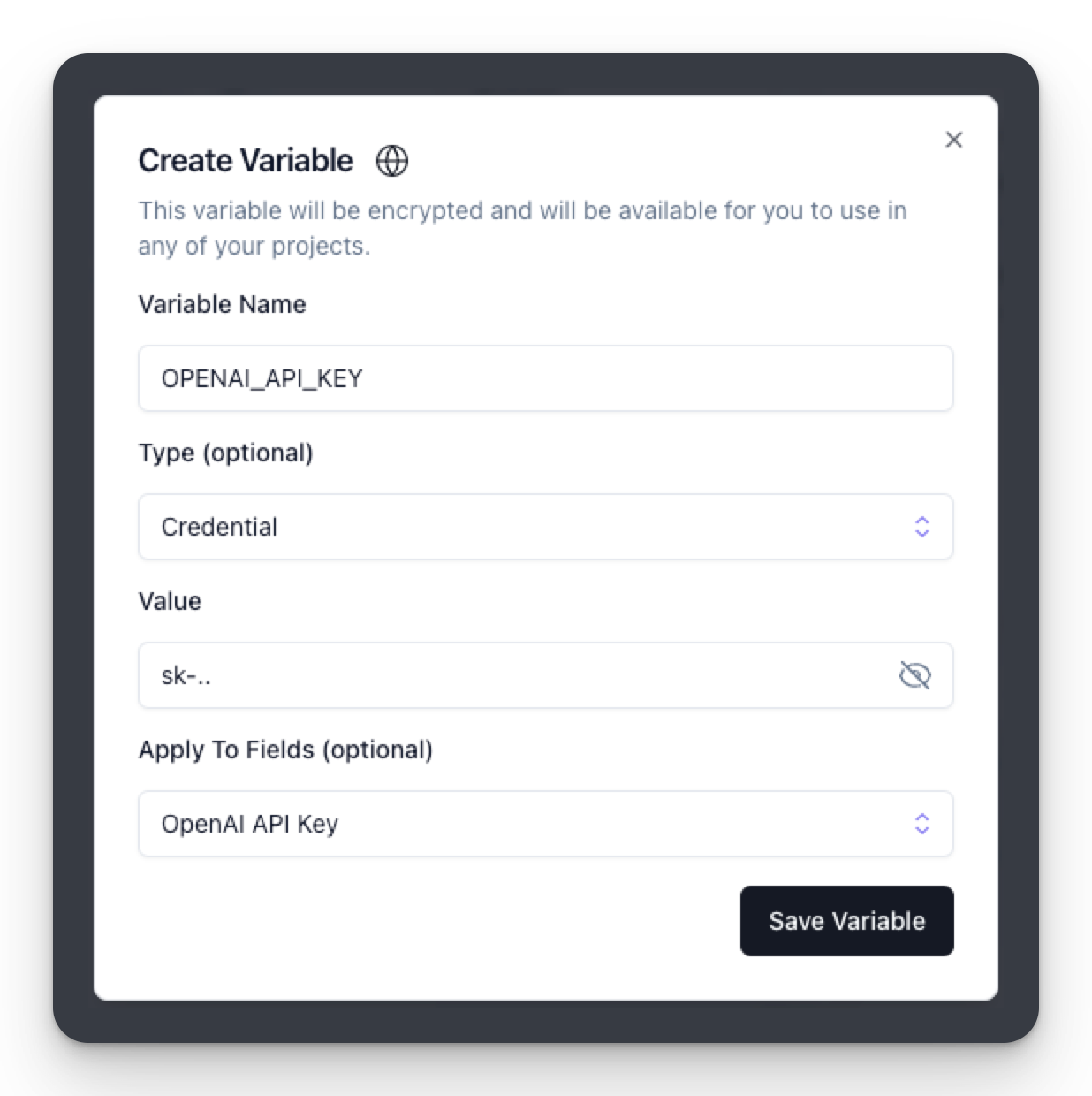 - Choose OpenAI API Key in the Apply to Fields field to apply this variable to all fields named OpenAI API Key.