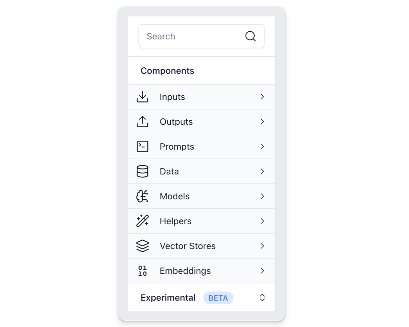 Located on the left, this the sidebar includes several collapsible sections that categorize the different types of pre-built components available in Langflow. Use the search bar to locate components by name.