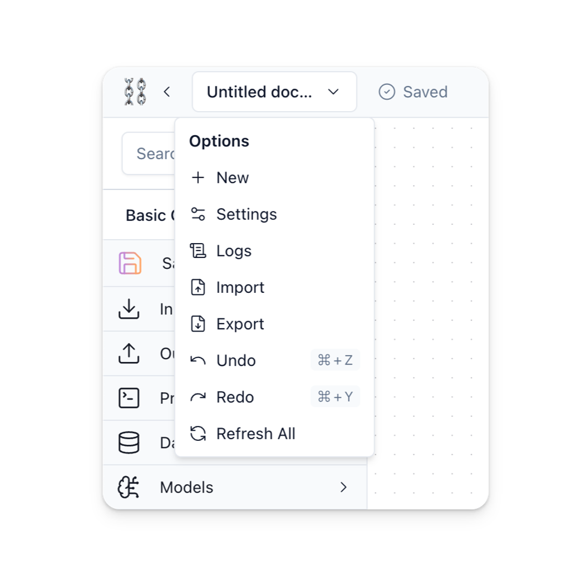 - Import: Import a flow or component from a JSON file into the Workspace.