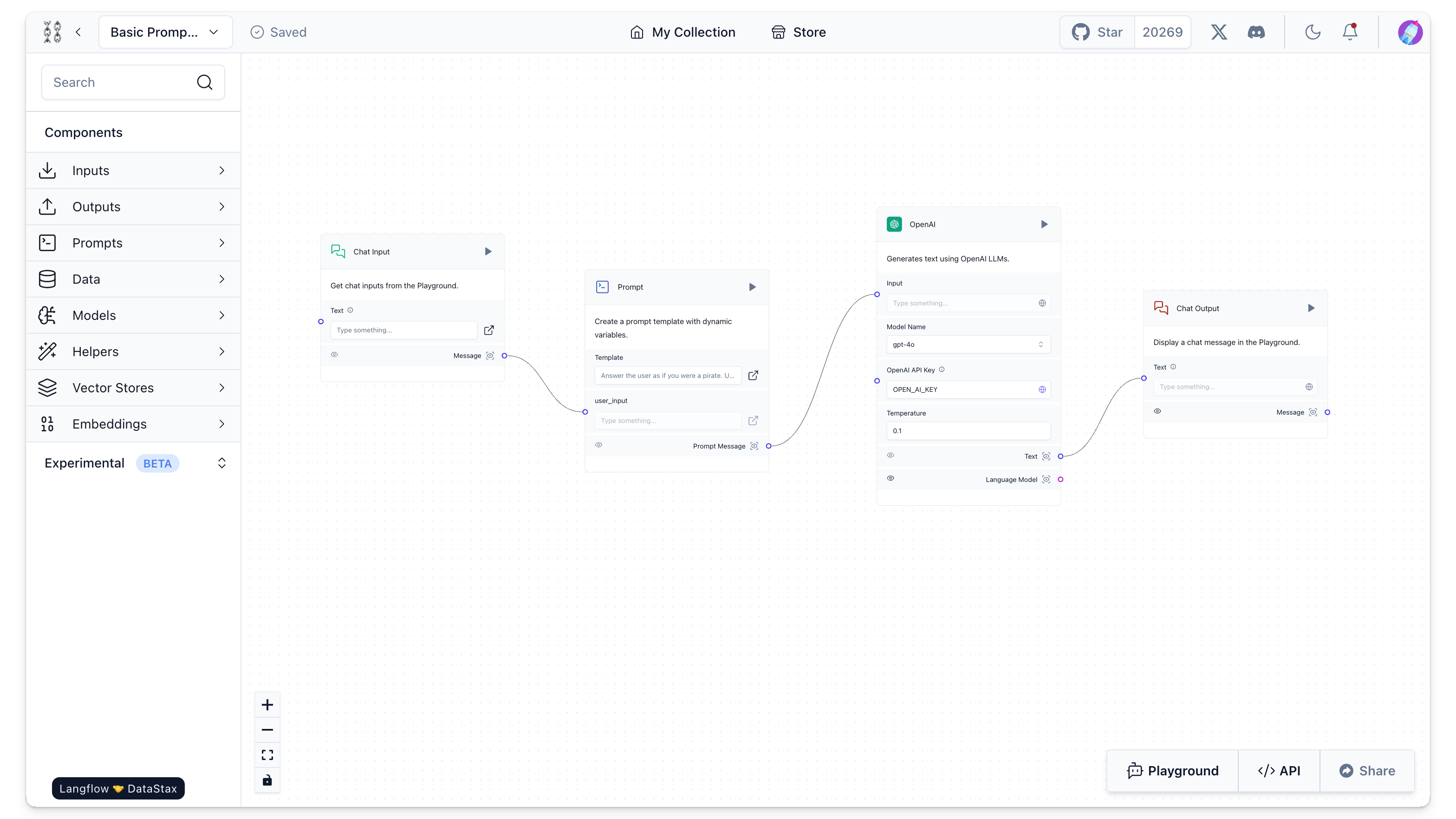 The Langflow Workspace is where you assemble new flows and create AIs by connecting and running components.